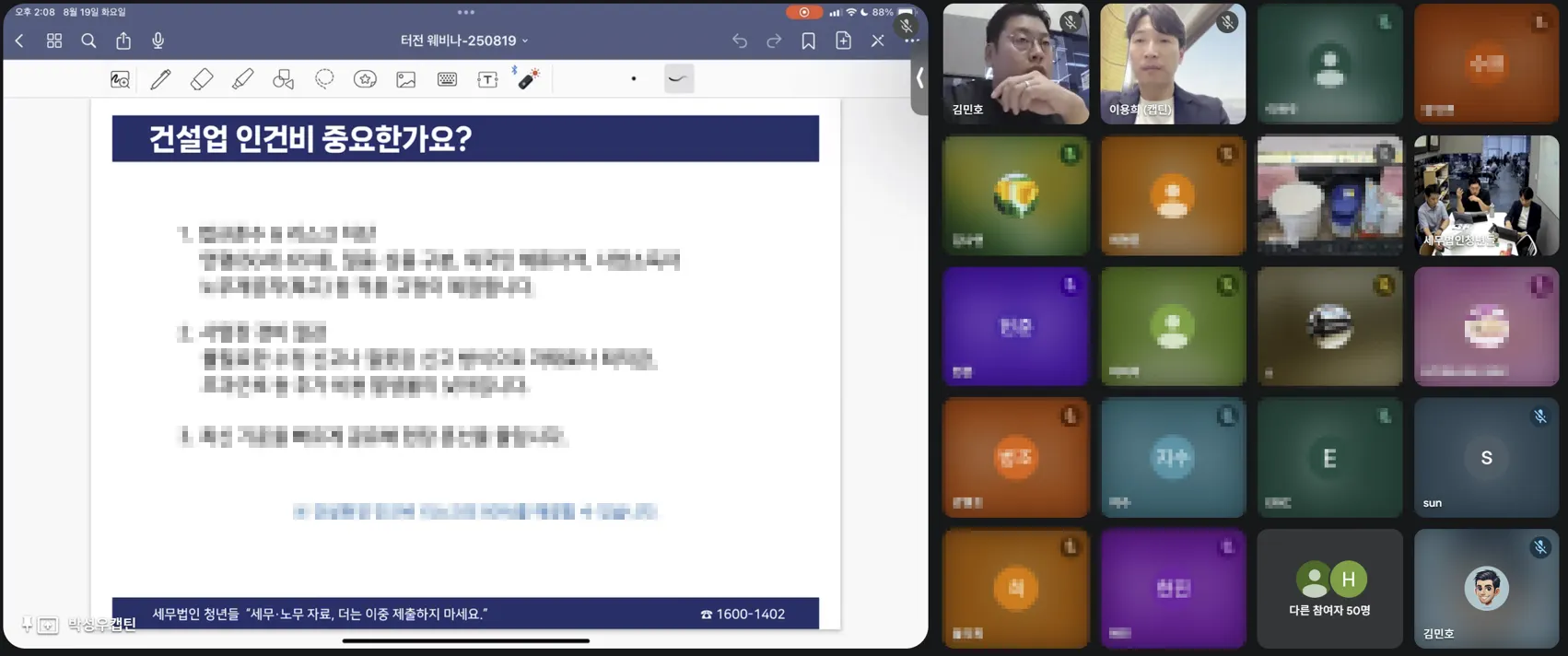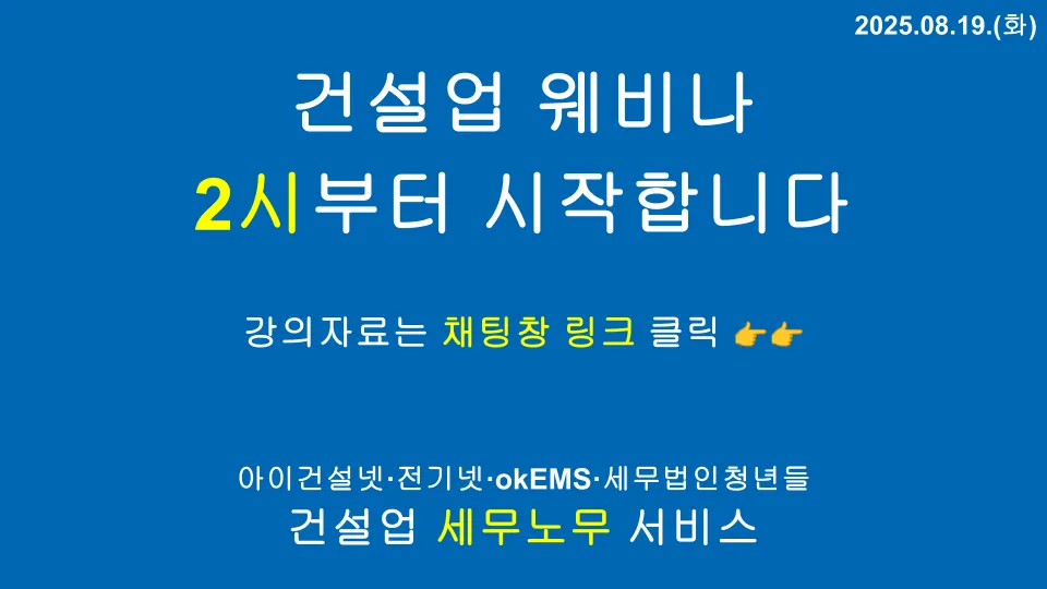 8월 19일 오후 2시부터 4시반까지 2시간 반 동안 아이건설넷, 전기넷, okEMS 회원사분들 대상으로 웨비나를 진행하였습니다.