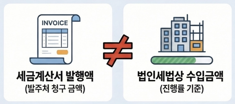 바로 부가가치세법상 세금계산서 발급금액과 법인세법상 매출 인식금액은 별개의 문제라는 겁니다. 법인세법에서는 건설업의 수익을 세금계산서 발행금액이 아닌, 진행기준에 따라 인식하도록 규정하고 있습니다.
