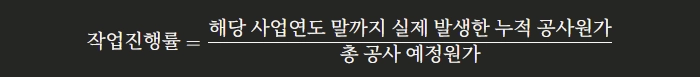 작업진행률은 다음과 같이 계산합니다. 그리고 전체 도급금액에 작업진행률을 곱한 금액이 올해 공사수익이 됩니다.