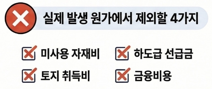 진행률 계산에 들어가는 '실제 발생 원가'에 아래 항목들은 포함하면 안 됩니다. 이 항목들은 실제 공사 진행 정도를 반영하지 않기 때문입니다.