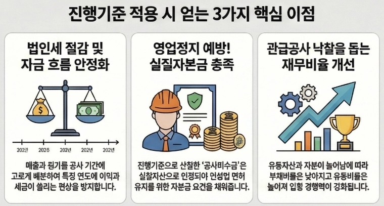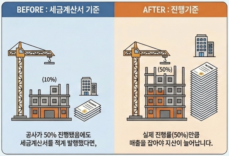 건설사 중에는 발주자에게 발급한 세금계산서 금액을 그대로 법인세법상 수입금액으로 계상하는 경우가 많습니다. 그러나 세금계산서 기준으로만 매출을 인식하면, 특정 연도에 이익이 편중되어 다음 해에 예상치 못한 법인세 부담을 떠안을 수 있습니다. 진행기준을 적용하면 공사 진행률에 맞춰 매출과 원가가 합리적으로 배분되므로 법인세 부담이 들쭉날쭉해 지지 않고 회사의 자금 흐름도 안정적으로 관리할 수 있습니다.